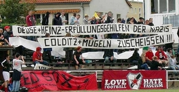 Roter Stern Leipzig >>> Roter Stern Leipzig is een sportvereniging uit het district Connewitz. De betekenis van de club ligt minder in zijn sportieve succes dan in zijn zelfbeeld als een "cultureel-politiek sportproject". De club zag pas het levenslicht op 1 februari 1999 opgericht door zo'n twintig alternatieve jongeren. Tien jaar later werd de Leipziger Bezirksklasse (8e Liga)bereikt en prompt was daar de tijdens de uitwedstrijd in het stadje Brandis een heftige confrontatie met rechts-extremisten.